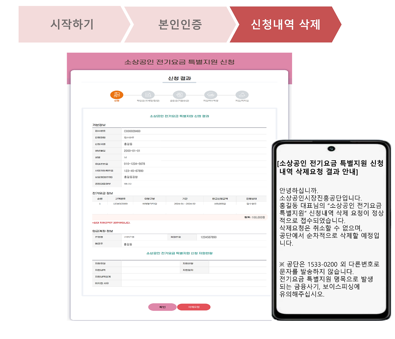 신청결과 페이지 하단에 [삭제요청] 빨간 버튼을 클릭하면 삭제요청 접수 문자와 처리 문자가 각각 들어오게 된다.